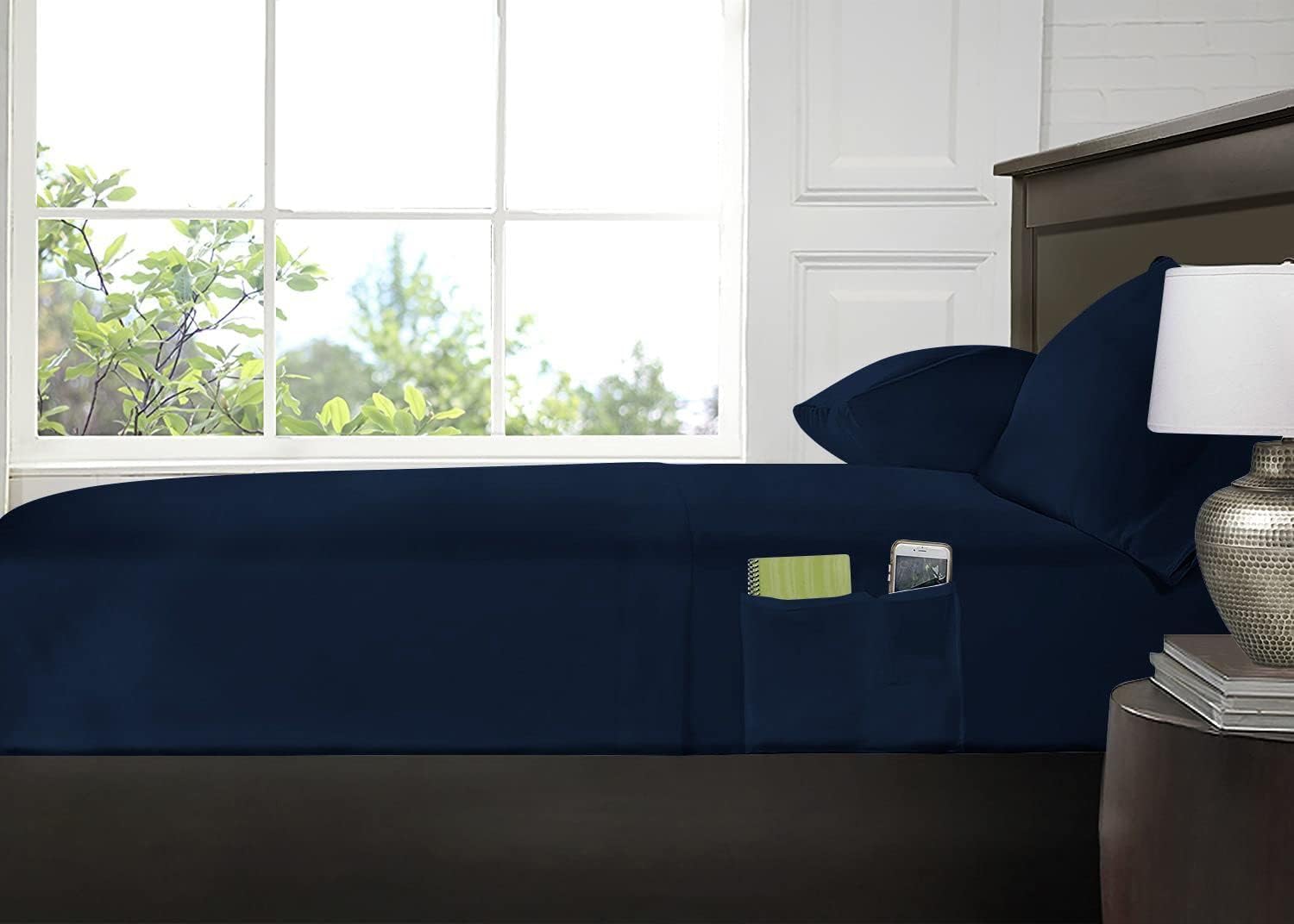 Package Contains (4) Piece Sheet Set 1-Piece Fitted Sheet comes with 1 Small Pocket: 4.75"W x 8"H, 1 Large Pocket: 7.75"W x 8"H, 1-Piece Flat sheet and 2-Piece Pillowcases only. 1000 Thread count Cotton Rich Blend to protect and beautify your down filled Sheet Set. Manufactured for durability, easy care and comfort. We offer supreme quality Egyptian Cotton bed linens with exclusive Italian Finishing. The packing of our product is biodegradable, as no Polymer material used by us. As we firmly believe in a Pollution free Earth. made of Egyptian Cotton. It will create a calm and relaxed atmosphere for your bedroom. These sheets are machine washable. However, due to differences in computer monitors, camera pixels ,screen resolution we cannot be responsible for variations in color between the actual product and your screen.