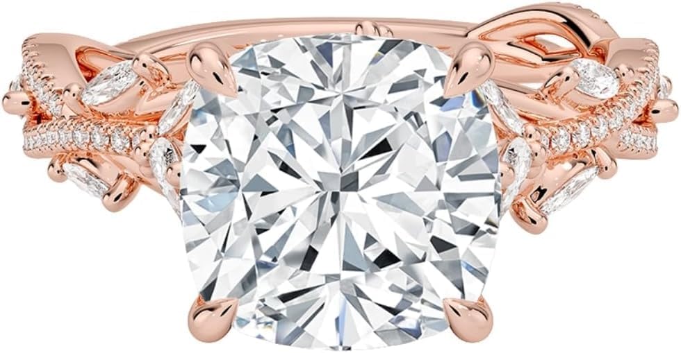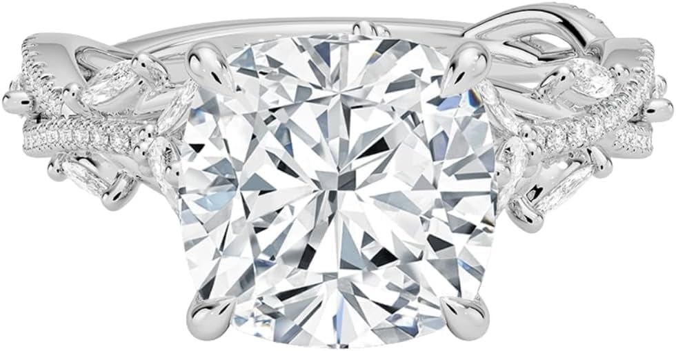 Soft structure. Natural elegance. Radiant clarity. This Cushion Cut Moissanite Engagement Ring blends timeless brilliance with organic inspiration. The cushion-cut center stone, available in 1–5 carat options, offers exceptional fire and depth, while its softly rounded edges create a balanced and romantic silhouette. Designed with delicate nature-inspired detailing, the band introduces subtle movement and grace, enhancing the center stone without overwhelming it. The result is refined sparkle framed by organic elegance. Crafted in Colorless VVS1 moissanite, this piece delivers remarkable clarity and diamond-like brilliance. Available in 925 Sterling Silver, 10K, 14K, or 18K Solid Gold (White, Yellow, or Rose), it is made for enduring comfort and lasting beauty. An expression of light. A reflection of love. Designed to be treasured.