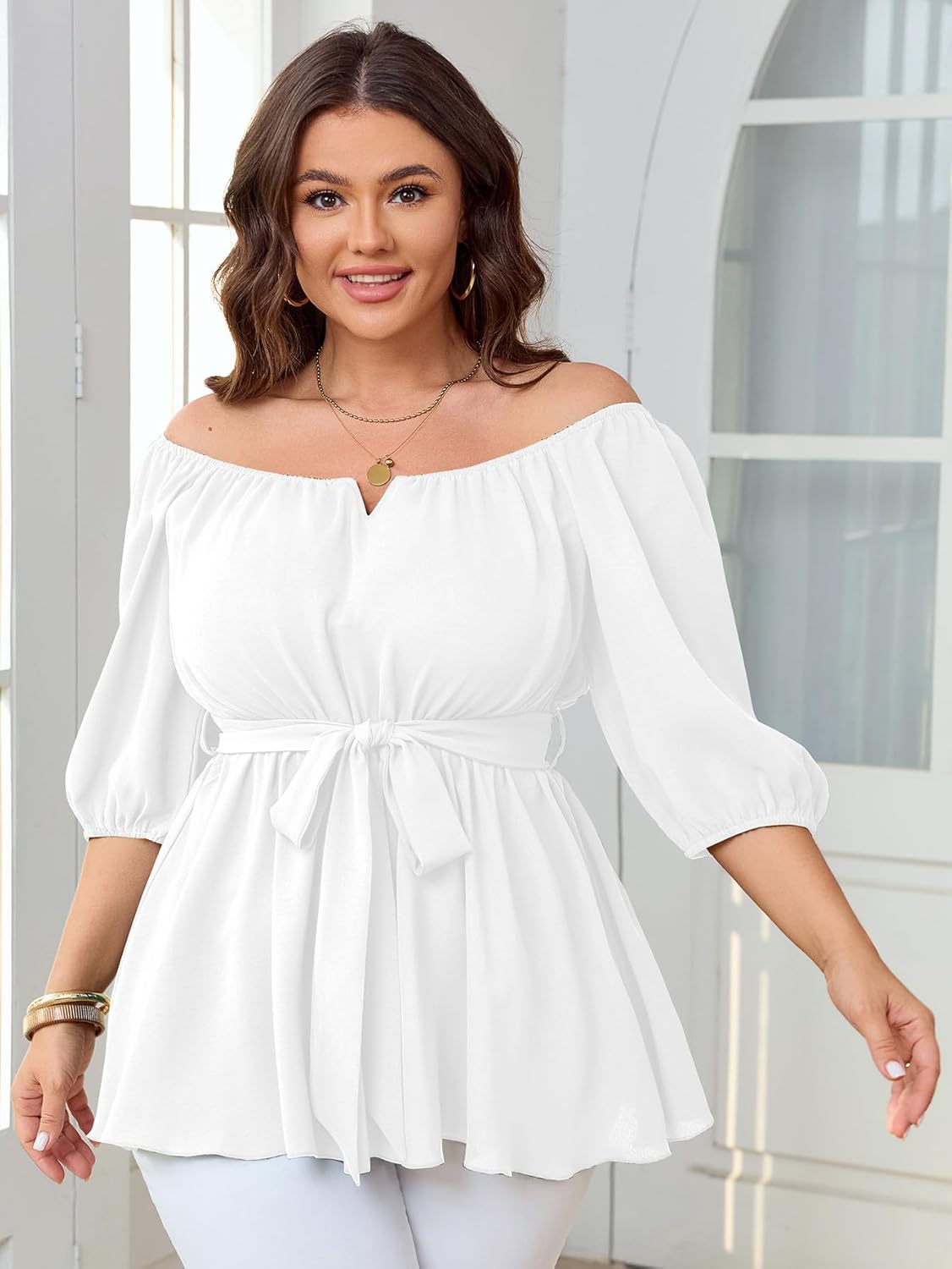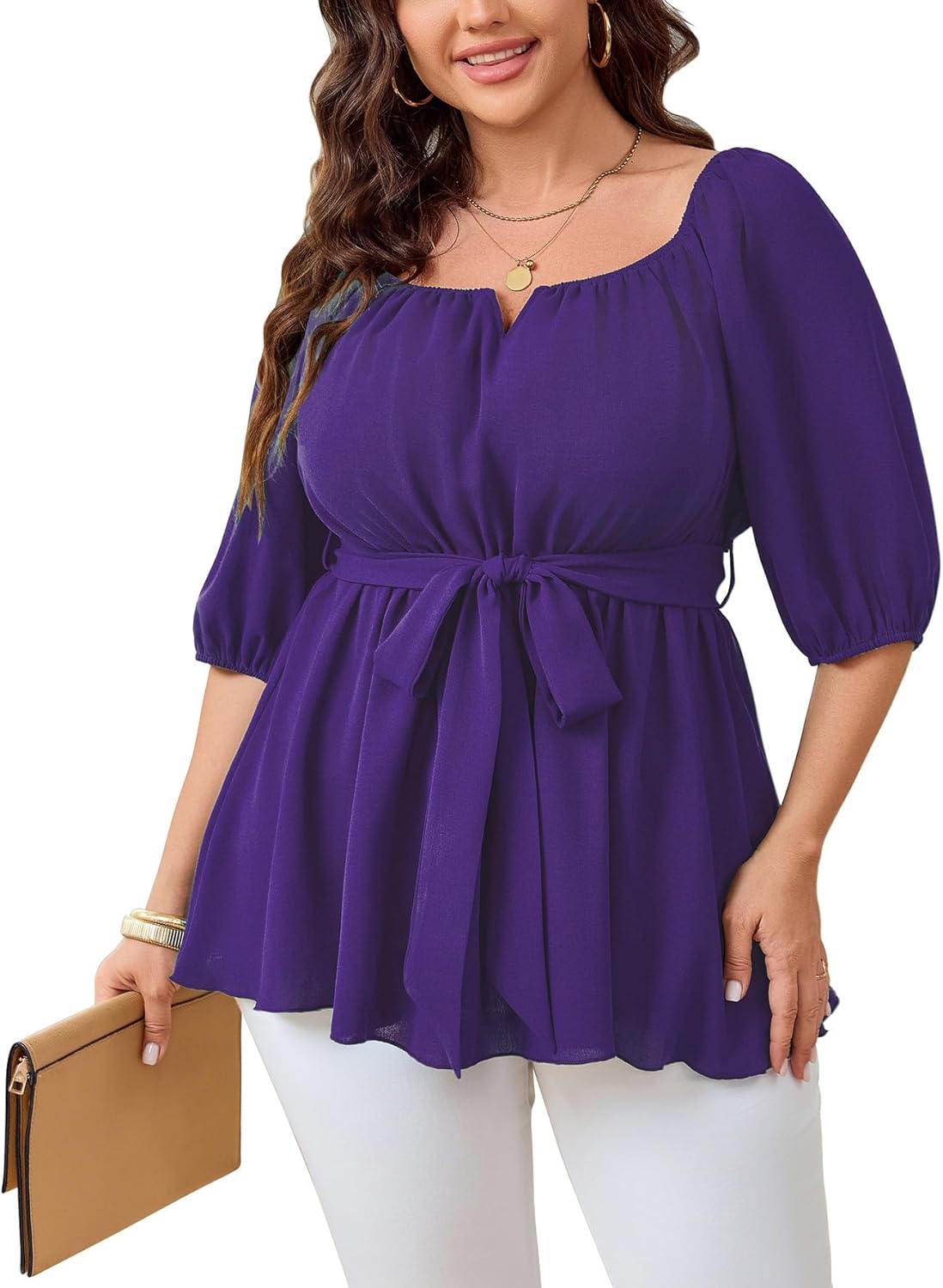 Design: Features adjustable necklines design, the peplum flowy blouse can be square neck, or off the shoulder. The 3/4-length puff sleeves have elasticized cuffs, adding a playful and trendy touch while allowing comfort and movement. Comes with a matching self-tie belt that cinches the waist for a flattering hourglass silhouette, enhancing curves. The flowy, flared hemline creates a comfortable and relaxed fit, while giving a polished, sophisticated look